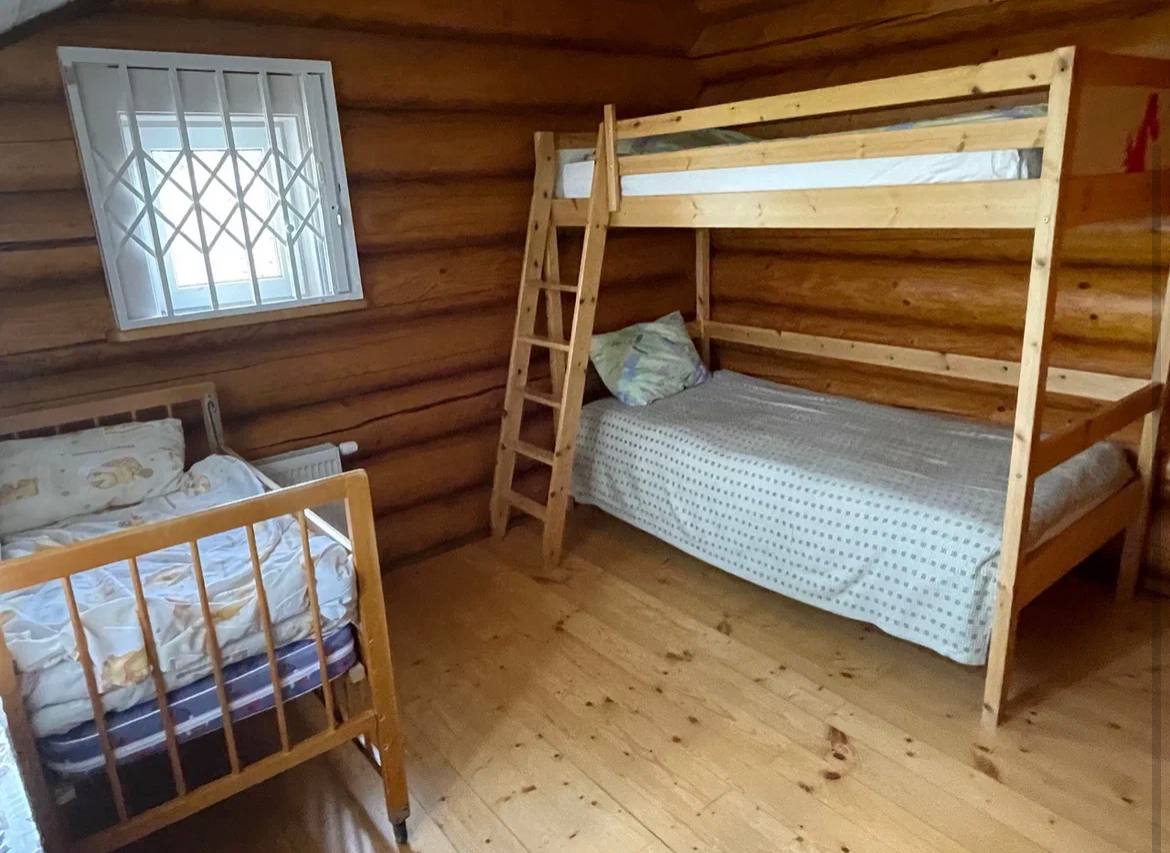 Комната с двухэтажной и детской кроватями на втором этаже. Детскую кроватку можно передвинуть в другую комнату, т.к. она на колесиках. Также в комнате есть шкаф, батарея, окна и тумбочка.