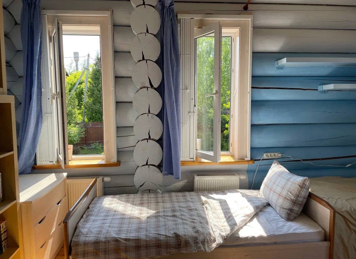 Детская комната на втором этаже в голубых оттенках на троих человек. В комнате находятся письменный стол, стул, шкаф и комоды для хранения вещей, стеллаж с большим количеством книг на любой возраст, три окна и батареи.