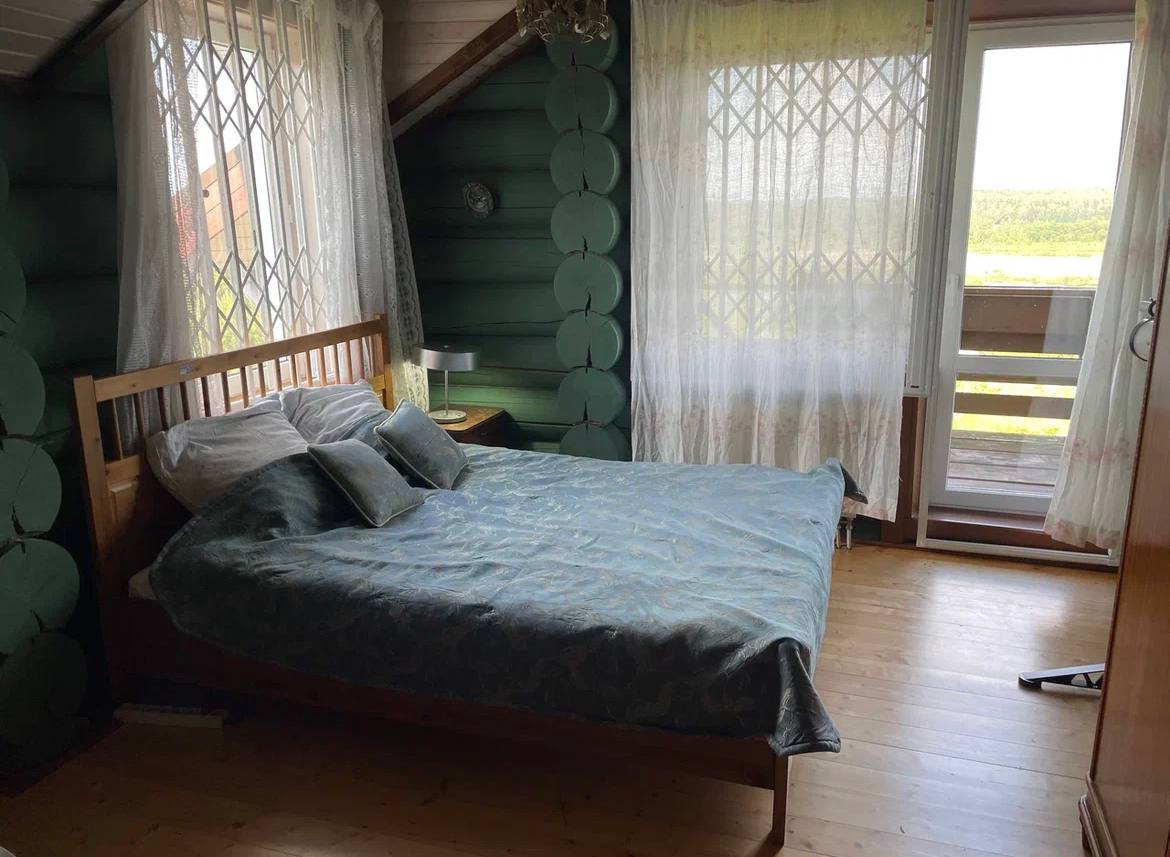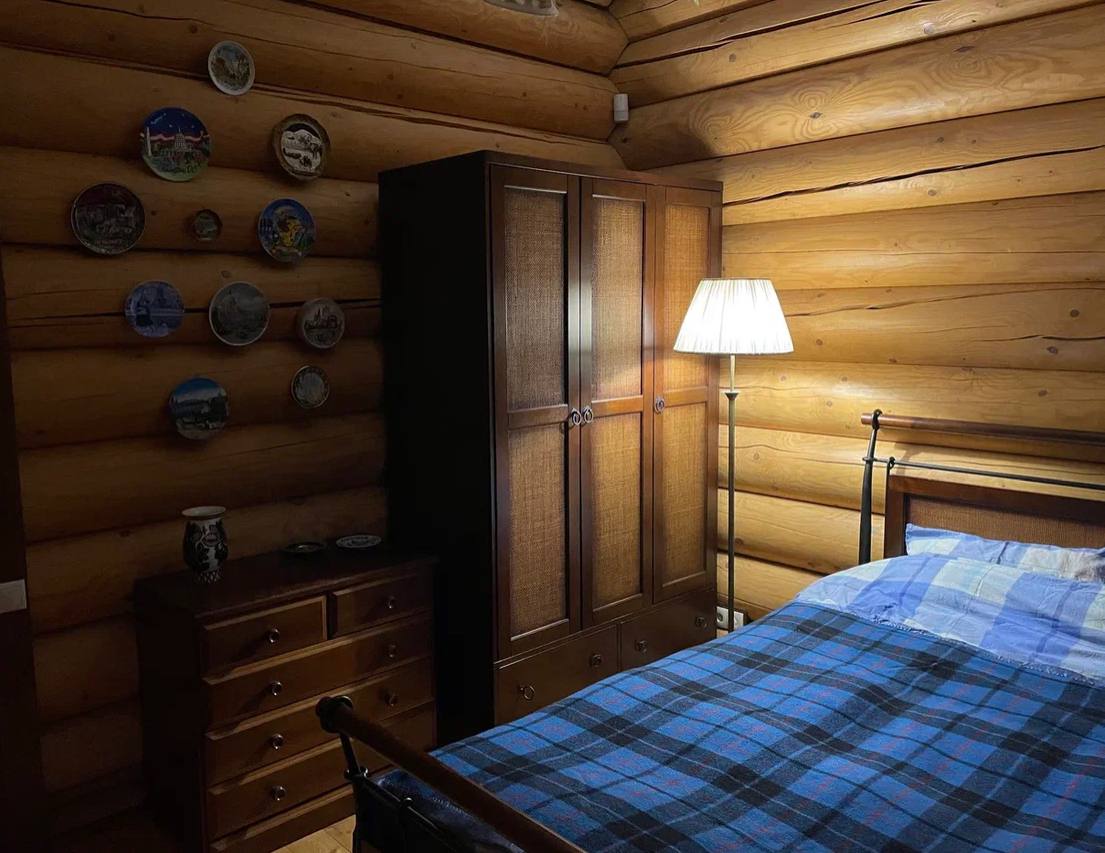 Комната с двухспальной кроватью на втором этаже. В комнате находится выход на балкон, большой стеллаж, в котором хранится запасное постельное белье, полотенца и прочее. Также в комнате имеется большой шкаф для хранения вещей, прикроватный столик, батарея и настольная лампа.
