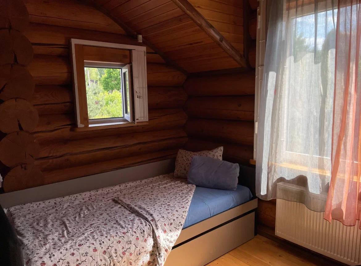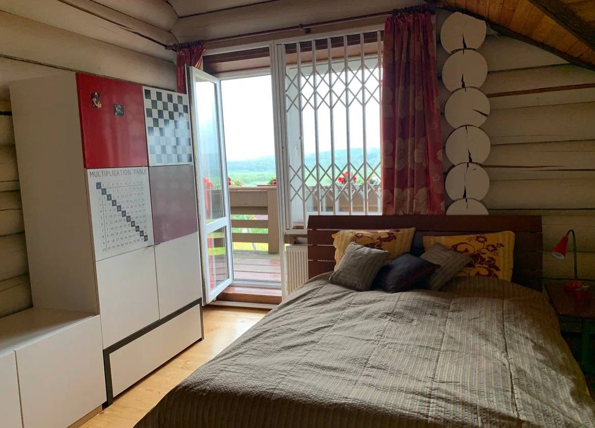 Двухспальная раскладываемая кровать на втором этаже. Там же находится шкаф с домашней библиотекой, круглый игровой столик с табуретками, стол с игротекой.